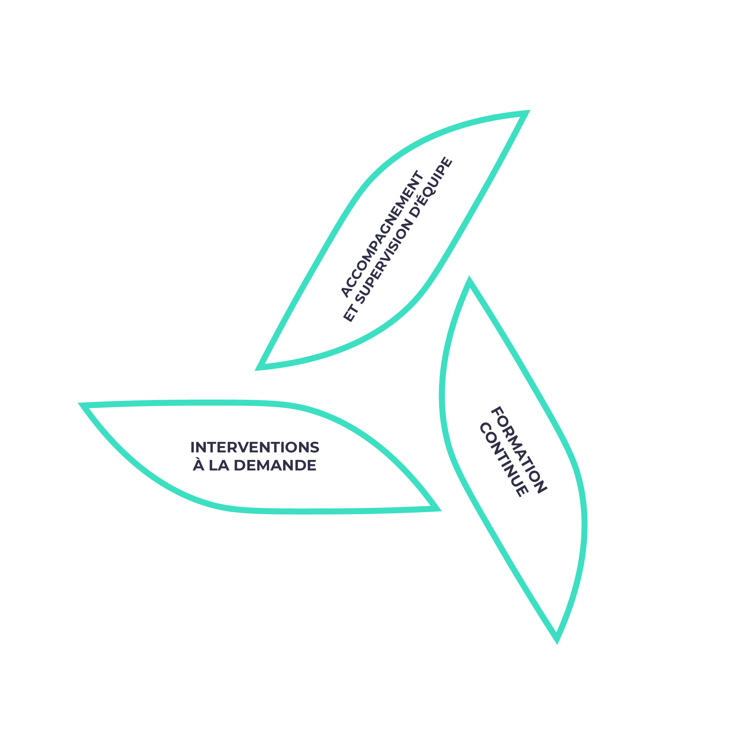 3 pétales circulaires : Symbole de la dimension trialectique en mouvement. La conception d’un accompagnement qui, dans l’action, favorise les interconnexions, la réciprocité et la reliance.
